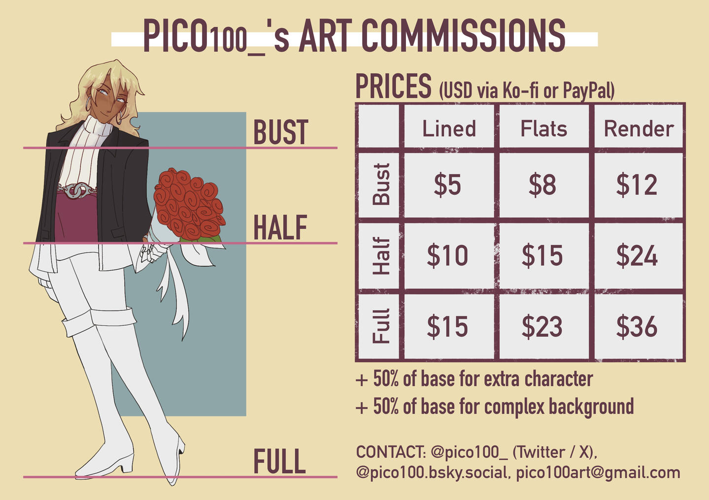 Should provide: commission type, references, and any specific notes such as: pose/composition, color palette, backgrounds, text, etc.